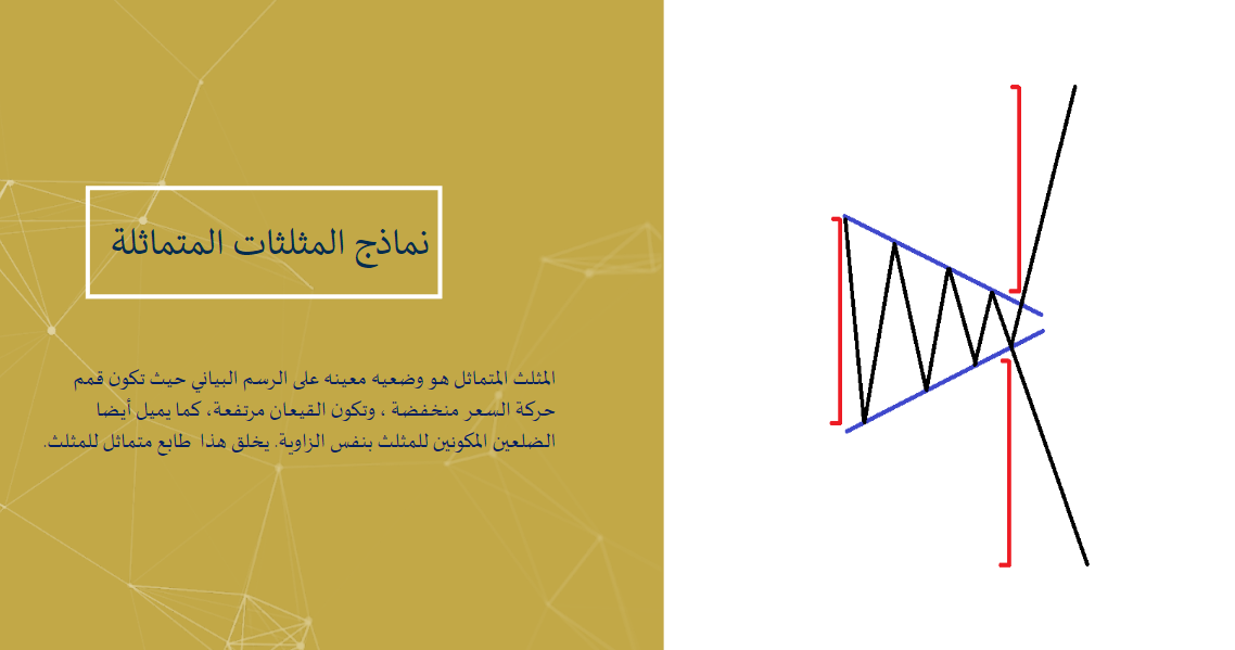 - نموذج المثلث المتماثل Symmetrical Triangle Pattern: حيث أن هذا النموذج يكون متماثل من الجهتين ولهذا السبب يكون مدرج في النماذج السعرية المحايدة.